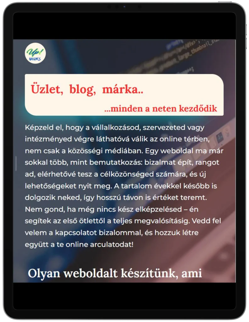 Képzeld el, hogy a vállalkozásod, szervezeted vagy intézményed végre láthatóvá válik az online térben, nem csak a közösségi médiában. Egy weboldal ma már sokkal több, mint bemutatkozás: bizalmat épít, rangot ad, elérhetővé tesz a célközönséged számára, és új lehetőségeket nyit meg. A tartalom évekkel később is dolgozik neked, így hosszú távon is értéket teremt. Nem gond, ha még nincs kész elképzelésed – én segítek az első ötlettől a teljes megvalósításig. Vedd fel velem a kapcsolatot bizalommal, és hozzuk létre együtt a te online arculatodat!